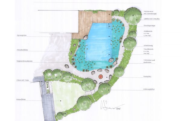 „Bei dieser Gartenumgestaltung wurde eine verwilderte Fläche komplett untergefräst, das Gelände modelliert, Sträucher zurück geschnitten und eine zweigeteilte Blühwiese mit umliegender Rasenfläche angelegt. Die Fläche wird sehr gut von Tieren und Insekten angenommen und fügt sich perfekt in das natürliche Umfeld ein. Für entspannte Abende um die Feuerschale haben wir noch einfache Steckstühle aus Altholz gebaut.“